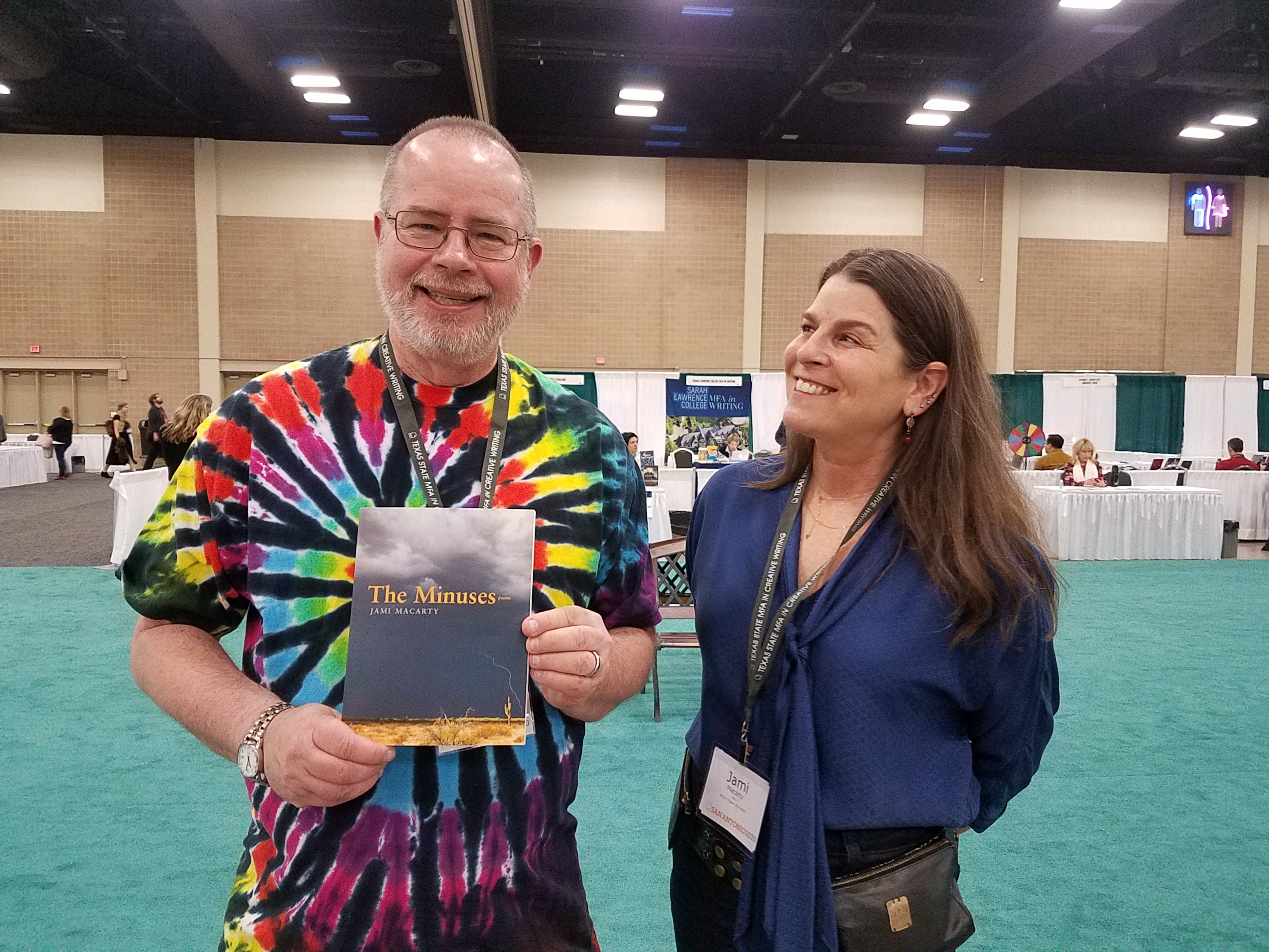 There, publisher Stephanie G’Schwind hosted me for a book signing at the Center for Literary Publishing booth. In the photo above: the Center for Literary Publishing booth all set up and ready for the conference. That’s The Minuses centered on the table! Below, that’s the lovely intern (name lost in the shuffle, on left) with publisher, Stephanie G’Schwind (right).