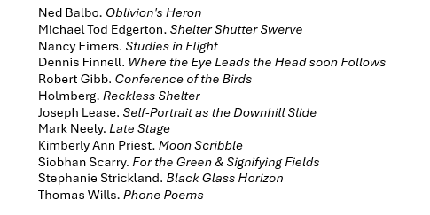 + I bow to the editors and the existence of publishers of poetry, such as Interim’s Test Site Poetry Series and the Besty Joiner Flanagan Award in Poetry.