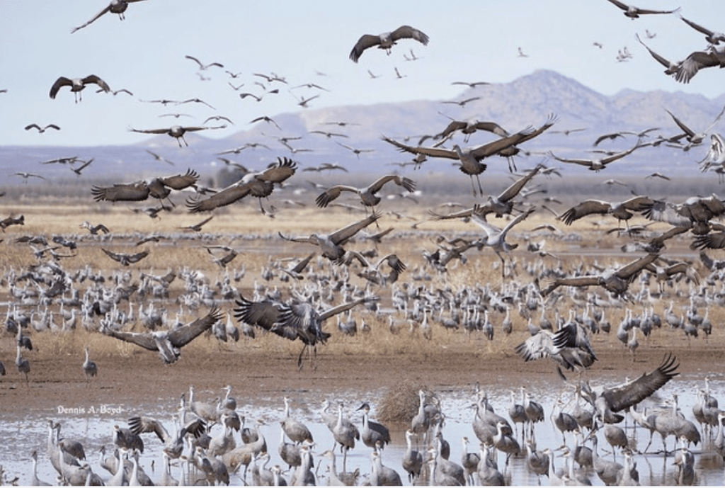 Above is a screenshot from wee three-minute finalist video—the background cover photo of The Whole Catastrophe by Dennis A. Boyd, features thousands of sandhill cranes at Whitewater Draw Wildlife Area—shown at H of the Night.