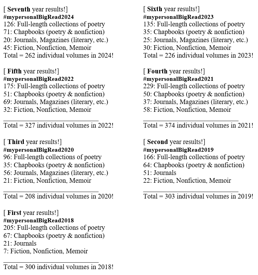 Reviewing is another facet of conversation that spirals out from books. A review faciliates conversations between author and reviewer and between reviewer and other readers of the book, and carries the possibility of building a community of readers around a book. In 2024, I offered 40 reviews, totalling almost 12,000 words, to poetry titles. Two long-form reviews were published in Colorado Review and The Malahat Review. Thirty-eight short-form reviews were published in NewPages. I tried to write four reviews a month… See the list below for when I achieved that goal.