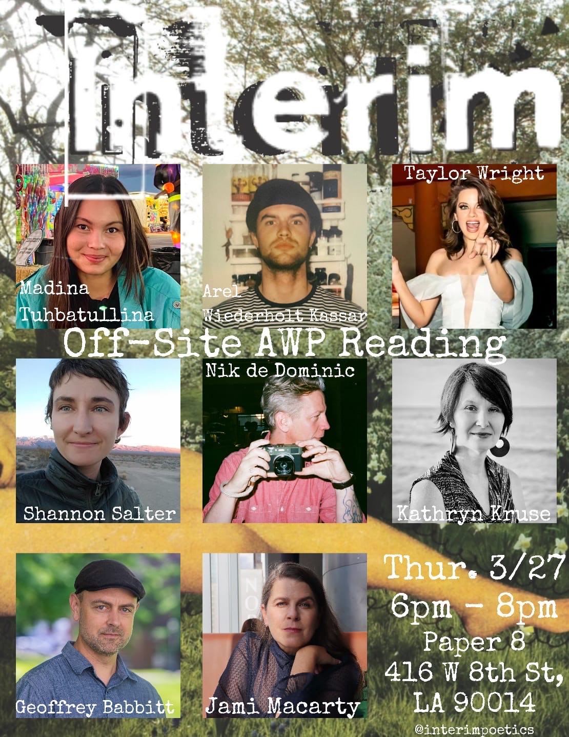 + Thank you bows (continuous!) to Claudia Keelan and Andrew Nicholson, series editors, and the series board Sherwin Bitsui, Donald Revell, Sasha Steensen, and Ronaldo Wilson of Interim’s Test Site Poetry Series, who selected The Long Now Conditions Permit (forthcoming University of Nevada Press, 2025).