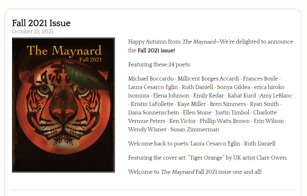 Here’s the fierce and fine cover of the Fall 2021 issue of The Maynard, “Tiger Orange” created by Clare Owen and a list of the issue’s poets.