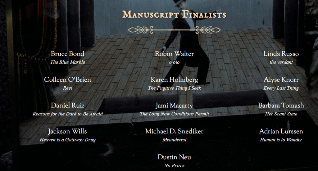 Then on February 21, Claudia Keelan, Editor of Interim Test Site Poetry Series notified me that my manuscript was a semi-finalist and still under consideration. A thrill for the poems and the poet! On March 6, Claudia wrote again to notify me that my manuscript was one of fifteen (1/15) finalists. More excitement! Kissing and dancing upon Earth. Tra la! Tra la!