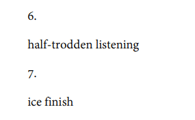 What do I mean by “created from”? I mean the poem was created by a process of highlighting some words—a sort of erasure—I was drawn to on each page of Hawthorne’s short story, removing the words from their original context to reveal new word combinations and meaning. This process, in effect, rendered all other words to the background, as if they had been erased. Sometimes that procedure would leave but two words on a page. For example, below are sections 6. and 7. (of the 22-sections) within the poem “Snow-Image.”